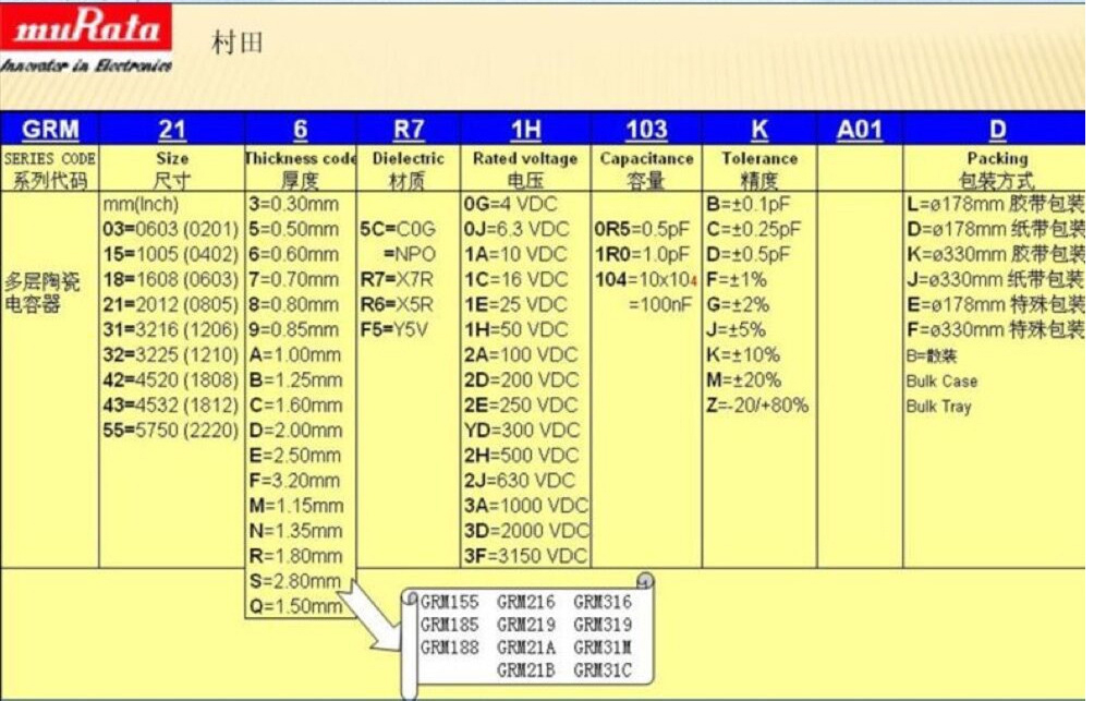 一、GR表示型號:村田貼片電容包含GC,GJ,GM,GQ,GR,KR,LL等