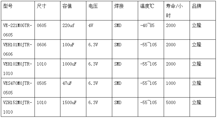 lelon(立隆)貼片鋁電解電容部分產品型號選型如下表