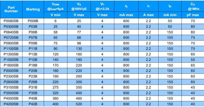 PXXX0SB系列TSS半導體放電氣管參數圖表如下